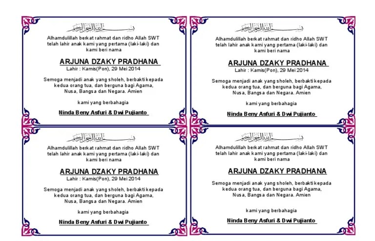 Gunakan foto editor canggih untuk mendesain kartu ucapan dari awal, atau cukup pakai contoh layout yang bisa diedit dari canva. Contoh undangan aqiqah bisa di edit 01. Contoh undangan aqiqah yang bisa di edit dan siap print cari tau?. 25 contoh undangan aqiqah dan kartu ucapan yang bisa di edit dan h download contoh undangan syukuran bayi tinpipohu 8 contoh dan template . Akan bagikan template atau dengan contoh kartu undangan aqiqah yang ada dalam bentuk microsoft word (.doc).